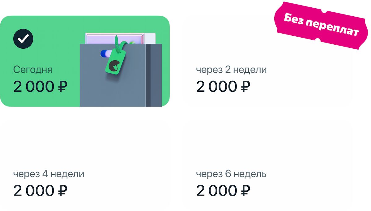 Базовый Сплит на 2 месяца — без переплат. Выберите товар, а затем оплату частями в сплит. Заплатите четверть цены и сразу заберите покупку. Остальные части спишутся позже — по комфортному графику